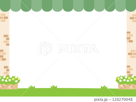 新緑、煉瓦、水彩、イラスト、背景、かわいい、葉っぱ、横型、アーチ
