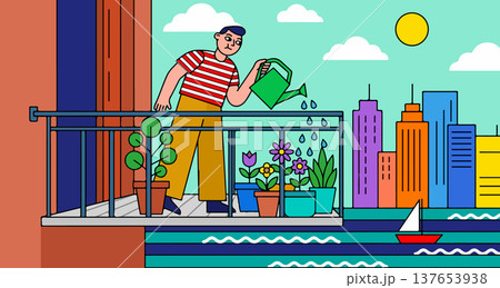 Man Watering Plants on Balcony with City View