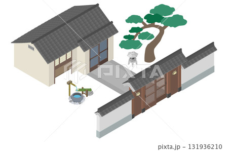 アイソメトリックイラスト:和風の門と日本家屋