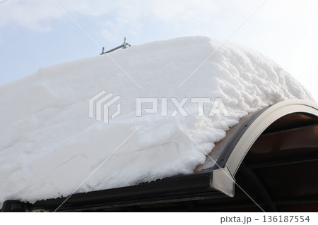 積雪、雪庇、カーポート、雪国、雪、冬、北海道、車庫、雪景色、冬景色、屋根、屋外、車、自動車