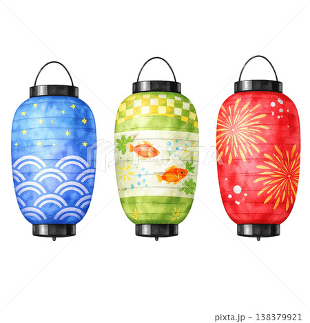 提灯セット 水彩イラスト 和風デザインの装飾素材 夏祭りやイベントに使えるシンプル手描き風