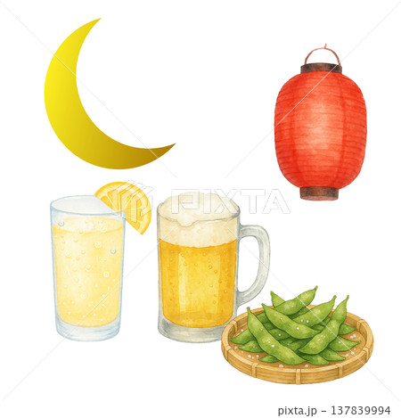 夜のお花見 ビールとレモンサワー 枝豆 提灯 春 水彩イラスト素材