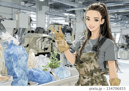 リサイクル工場で成果を喜ぶ女性作業員 ガッツポーズ
