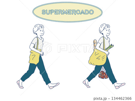 エコバッグを持ってスーパーマーケットで買い物をする日常風景|買い物、スーパー、エコバッグ、人物、