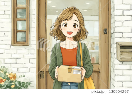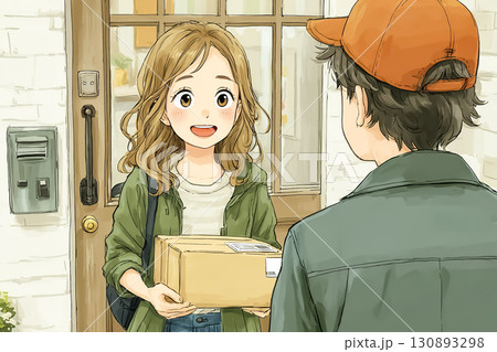 シンプル イラスト 笑顔で荷物を手渡しする配達員の女性
