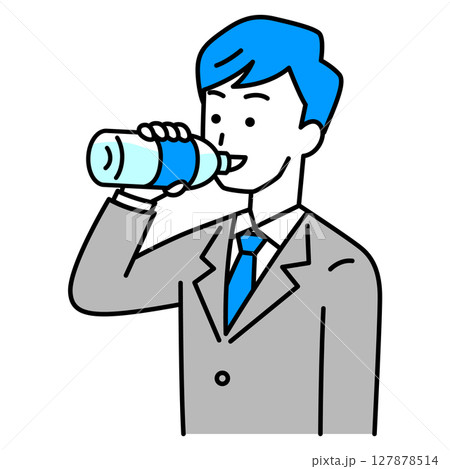 猛暑対策に水分補給するビジネスマン, 熱中症予防に水を飲むスーツ男性, 屋外作業前に水分補給するビジ