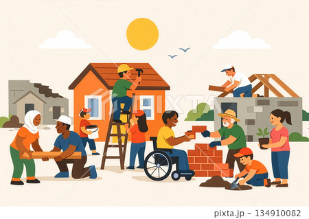 多様な人々が協力して家を再建する復興ボランティアイラスト
