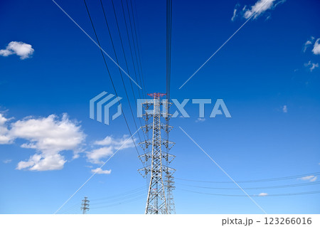 快晴の空にそびえる送電鉄塔 c-3 暖色寒色強調
