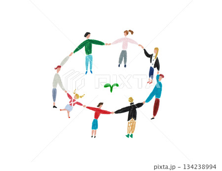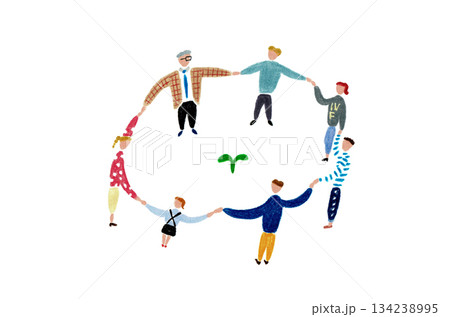 手描きイラスト 双葉の周りを囲み、手をつなぐ人々