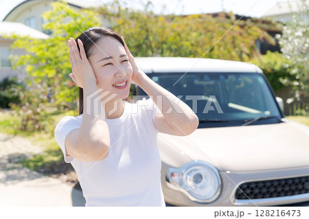 車の横で頭を抱える女性