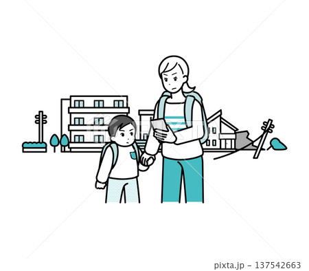 災害で避難する親子 ヘルメット付き