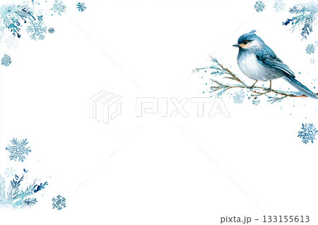冬の小鳥と雪の結晶を描いた水彩フレーム背景