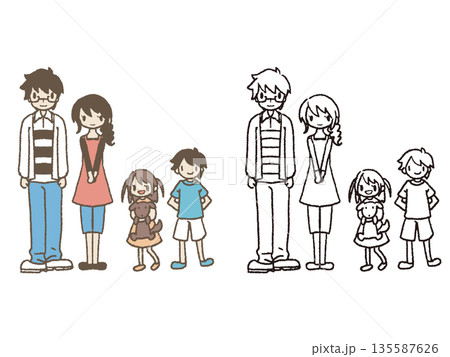 4人家族 赤ちゃん 姉 抱っこ 見つめる 笑顔 モノクロ 手描き イラスト