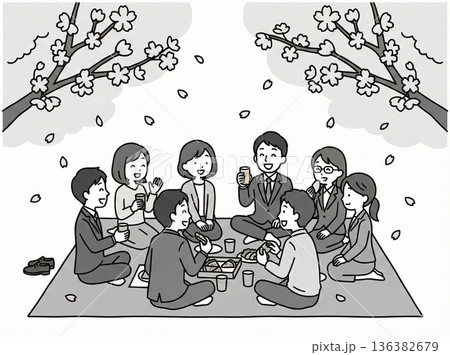 楽しそうに桜の下でお花見をする若い社員 モノクロイラスト