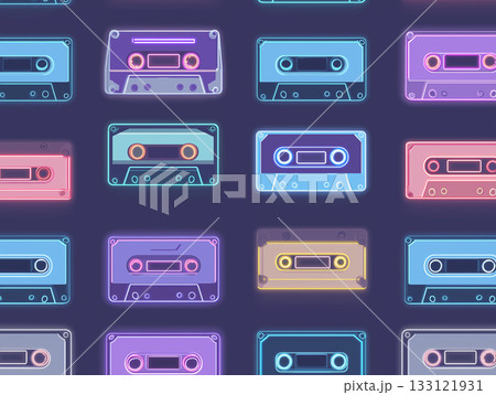 レトロなカセットテープが並ぶカラフルなミュージックパターン