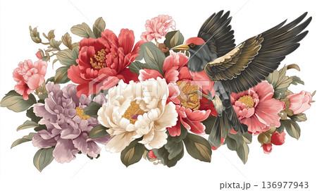 和風装飾をテーマにした花と鳥の豪華イラスト、存在感ある大輪の花と優美な小鳥が際立つ構図、白背景