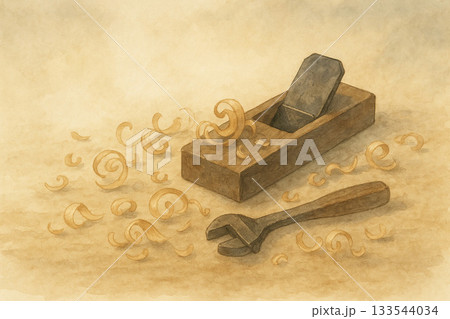工具シリーズ:削りかけの木片と鉋を描いた構図