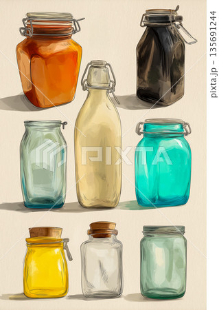 ガラス瓶・保存容器の手描きイラストセット 水彩風 背景素材