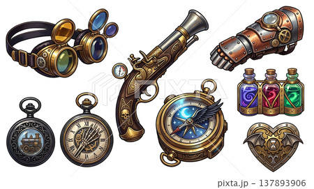 レトロスチームパンクの武器やアクセサリーRPGアイテムベクター素材