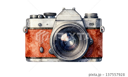茶色のレザーとシルバーの一眼レフカメラの水彩イラスト
