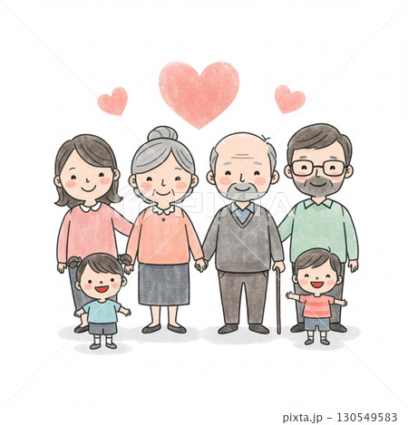 三世代の家族イラスト|祖父母と両親、子どもたちの幸せな笑顔