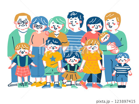 三世代家族の横並びイラスト|祖父母と両親、子どもたちの笑顔