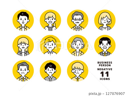 オフィスで働くネガティブな表情のビジネスパーソンのアバターアイコン素材セット_円形_ベクター_カラー