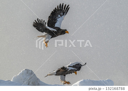 北海道鶴居村の給餌場から飛び立つタンチョウの群れ