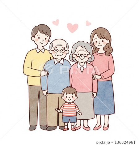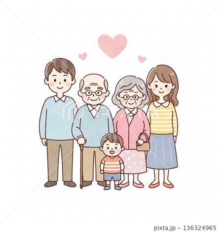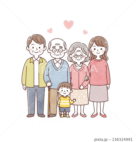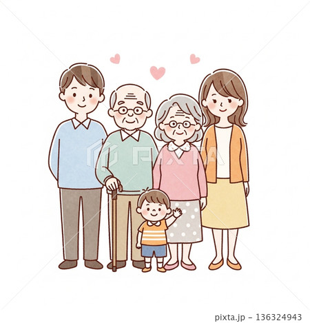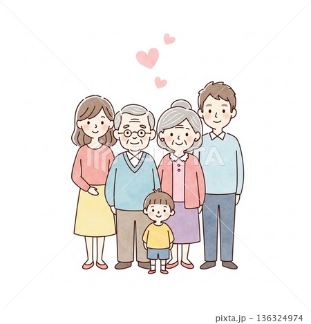 三世代家族が寄り添う温かいイラスト|祖父母・両親・子ども