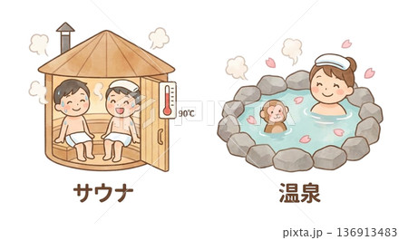 温泉に入ってリラックスするカップル・夫婦の手書きベクターイラスト
