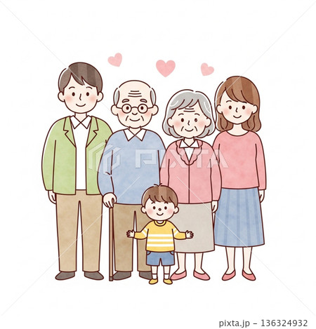 三世代家族が寄り添う温かいイラスト|祖父母・両親・子ども