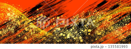 金箔、金粉、砂子の舞う日本画風テクスチャと朱色背景ワイドサイズイラスト