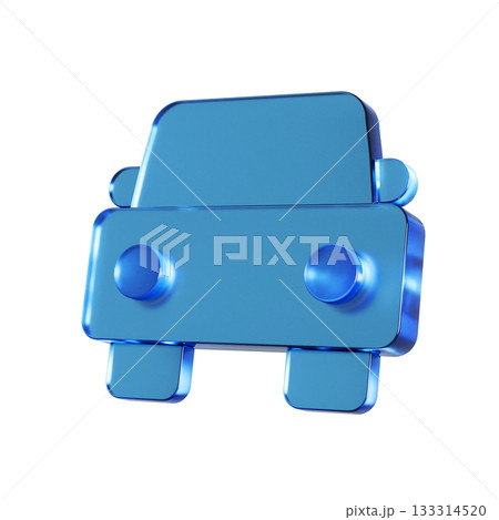 自動車のフラットなアイコンの3Dイラスト。透明感のある青いグラスモーフィズムなマーク