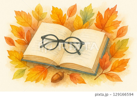 落ち葉に囲まれた本とメガネの秋のイラスト