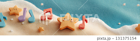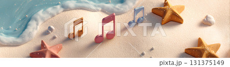 砂浜で遊ぶ音符と星の木工細工(3D)横長
