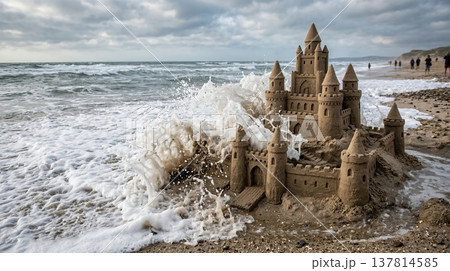 波に呑まれて崩れる砂の城・浜辺の情景(諸行無常・終わり)