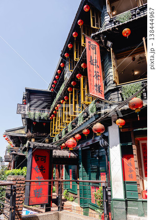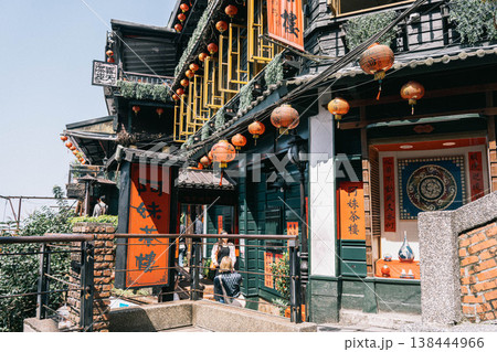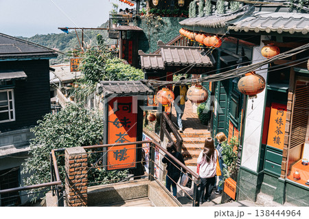 woman traveler visiting in Taiwan, female Tourist with backpack sightseeing and shopping at Jiufen Old Street market. Popular landmark and attractions near Taipei City. Travel and Vacation concept