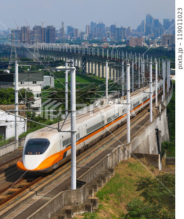 市街地を背景にカーブを曲がり走る台湾新幹線(台灣高鐵)