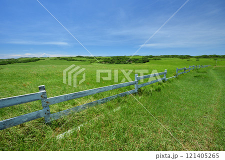 海岸線生長的綠色草坪和蔚藍海洋天空景色