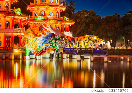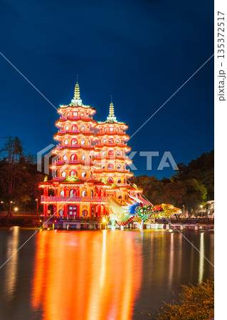 高雄 蓮池潭のシンボル 龍虎塔 夜景