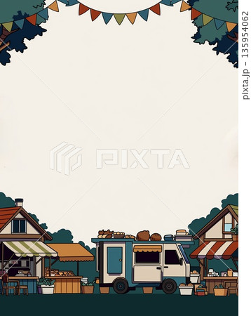 キッチンカーと屋台が並ぶお祭りのフレームイラスト