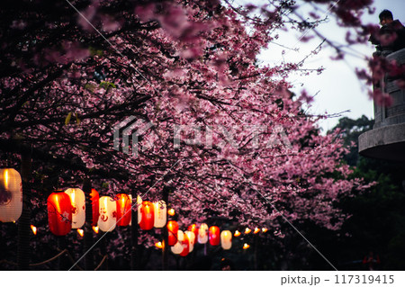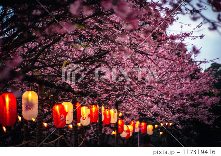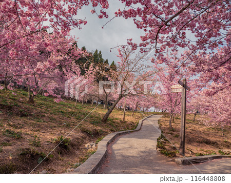 盛開粉紅色的櫻花林及石板小徑景觀
