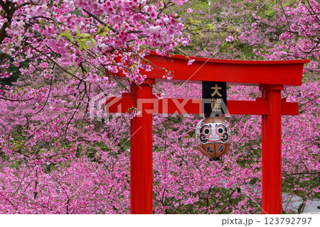 盛開的粉色櫻花和神社鳥居