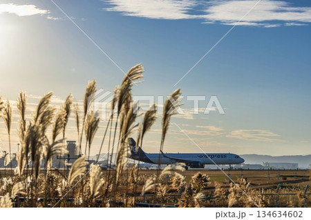 夕暮れの仙台空港 夕日とススキ 宮城県名取市