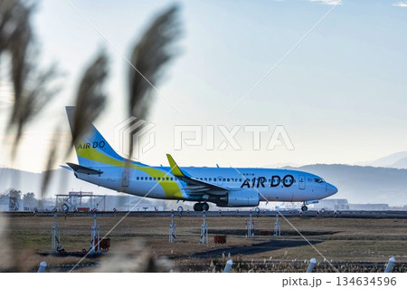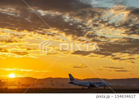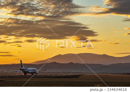 夕暮れの仙台空港 タキシング中の飛行機 宮城県名取市