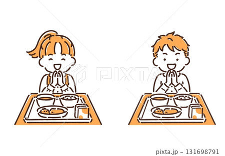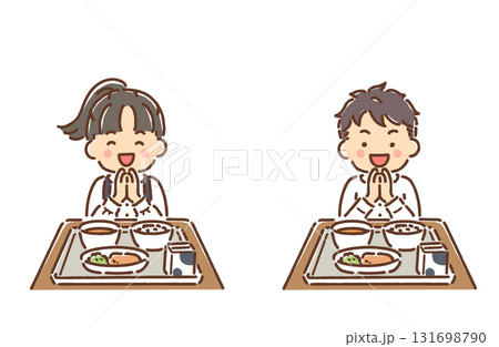 給食を食べようと手を合わせている小学生の男の子と女の子セット