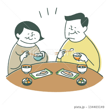 健康的な和食を食べる高齢男女