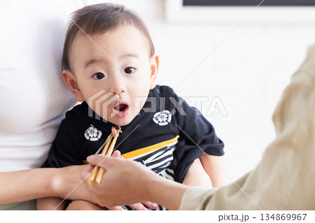 実家へ帰省した家族とおばあちゃんで囲む正月の食卓