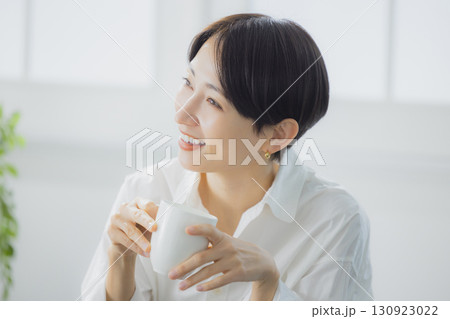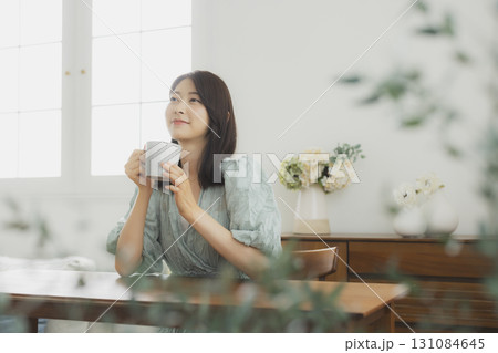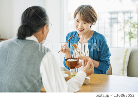 家でご飯を食べながら夫と楽しく話すミドル女性