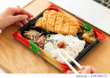 会社のデスクでトンカツ弁当を食べるミドル女性